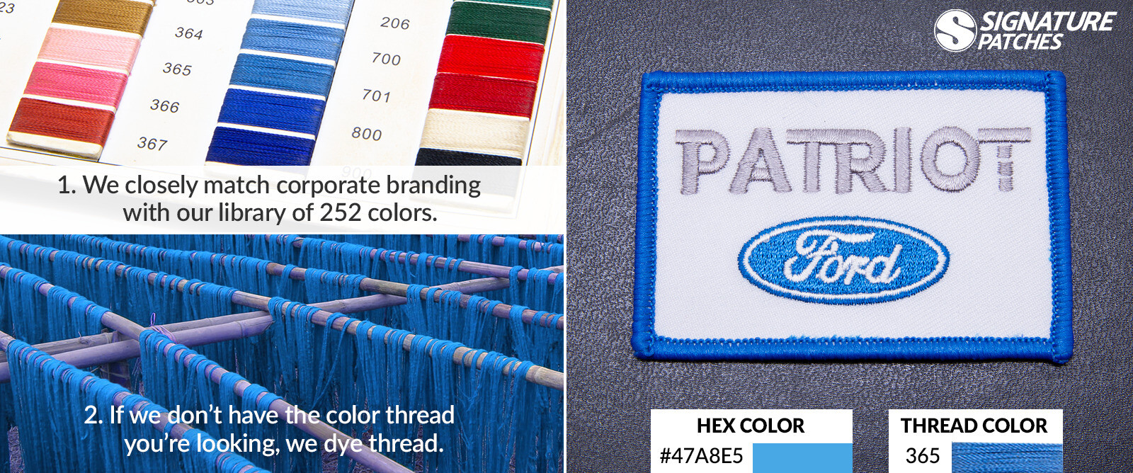 Here at Signature Patches, we base all of our colors on the Pantone Matching System. However, while the spectrum of Pantone colors covers more than 1800 different hews, we only have the 252 thread colors and 72 mesh colors from our color chart pictured earlier. However, that doesn’t mean we can’t use the Pantone colors you need for your patches.