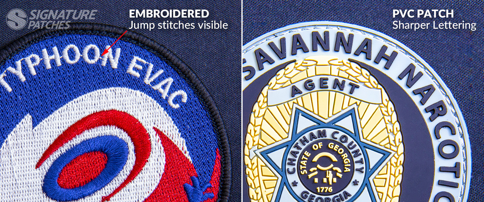 The polyvinyl chloride material we use to mold these types of designs has a texture similar to soft rubber. So, not only do they look completely different than a traditional patch, they also feel different. Threaded patches have the warm texture of fabric, like a comfortable sweater or flannel shirt, and PVC patches have a cool, flexible rubber texture.