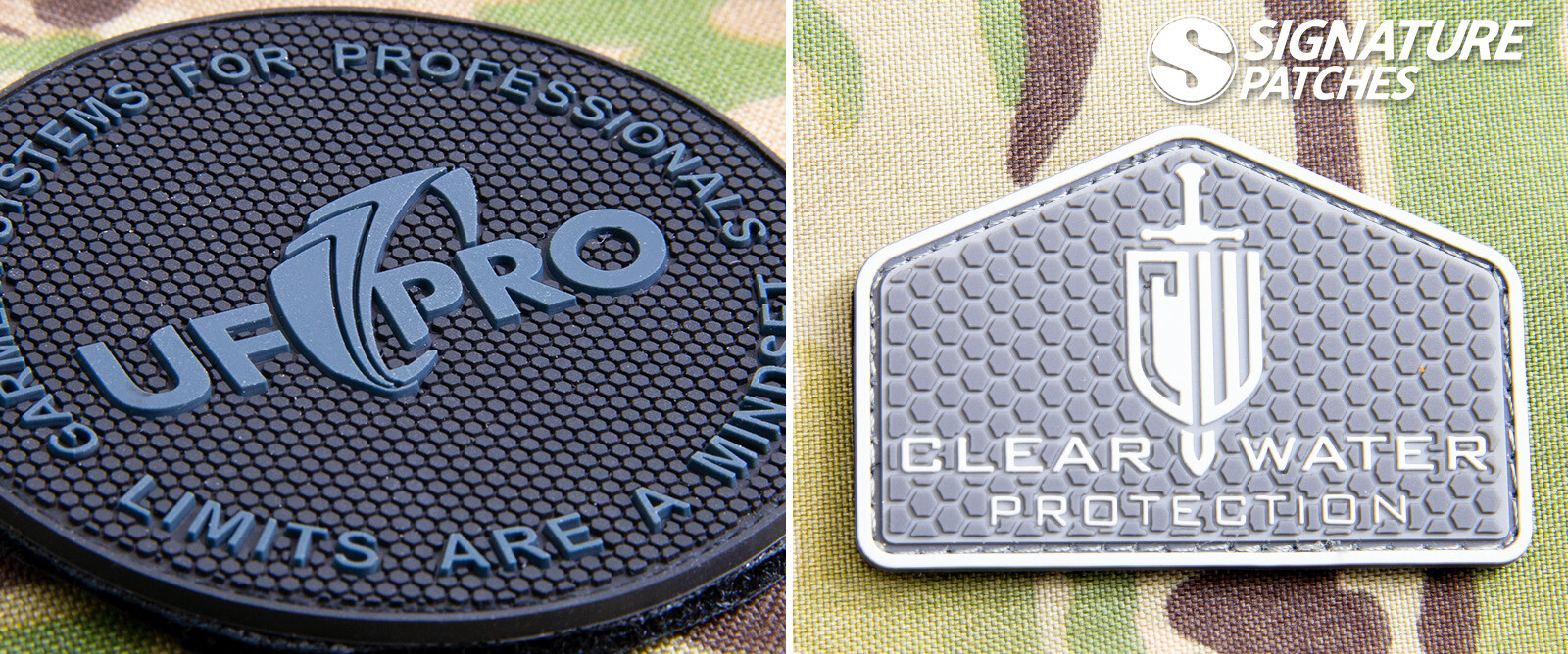 Since PVC patches are molded, we can raise or recess text in the design. Changing the level of the words printed in the artwork creates a natural contrast, making messages much more legible than they would be in if sewn or printed onto a mesh surface.